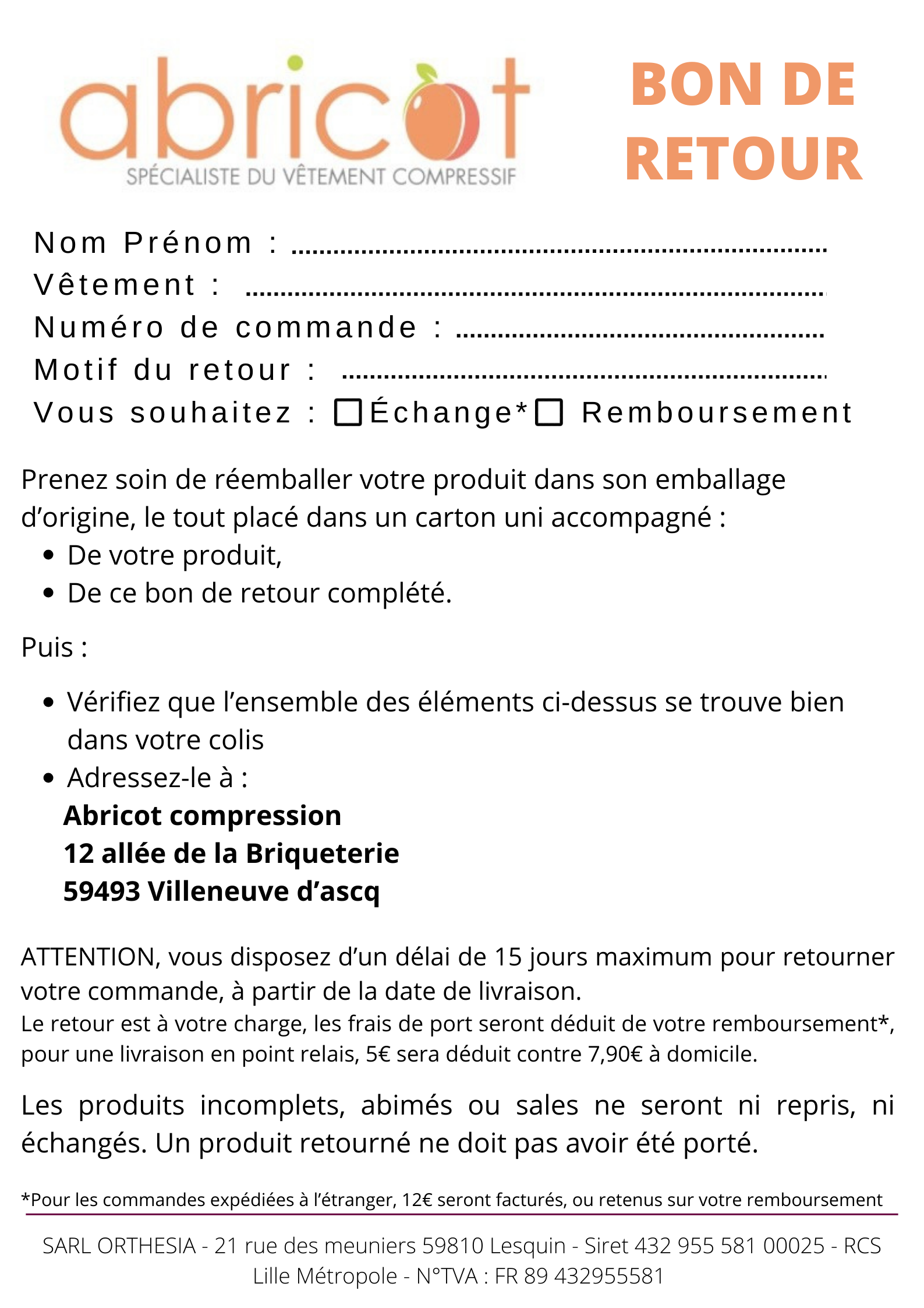 Les articles proposés à la vente sont ceux qui figurent dans le catalogue publié dans le site de abricot-compression.com. Chaque article est accompagné d’un descriptif établi par SARL ORTHÉSIA. Les photographies du catalogue sont les plus fidèles possibles mais ne peuvent assurer une similitude parfaite avec l’article proposé à la vente, notamment en ce qui concerne les couleurs, les motifs et les matières.